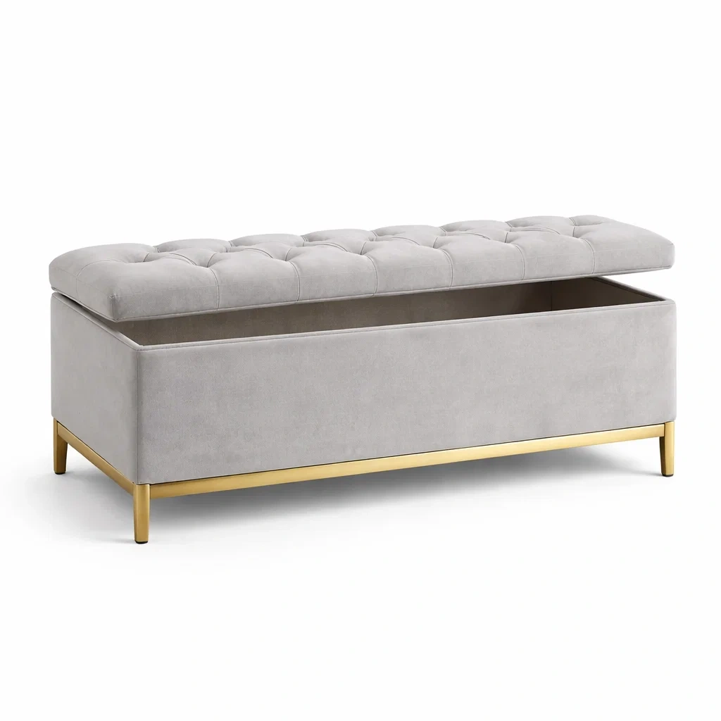 Banc de rangement rectangulaire en velours gris avec pieds en métal doré 120x45x40 cm