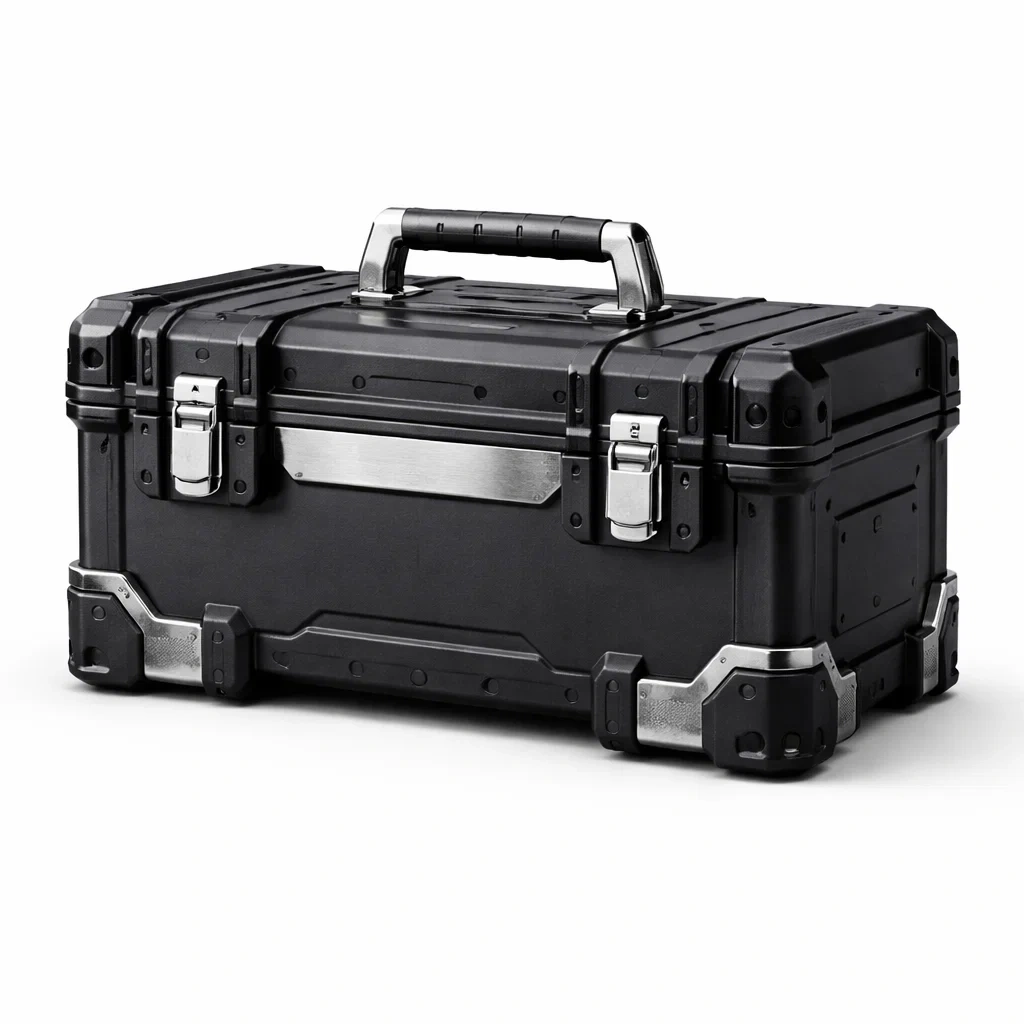 Boîte à outils portable fabriquée en plastique ABS résistant et en acier inoxydable. Dimensions : 40 cm de longueur, 20 cm de largeur, 25 cm de hauteur. Couleur : Noir. Poids : 2.50 kg. Rangement sécurisé avec fermetures en métal et poignées ergonomiques pour un transport facile. Angles renforcés pour une protection accrue.